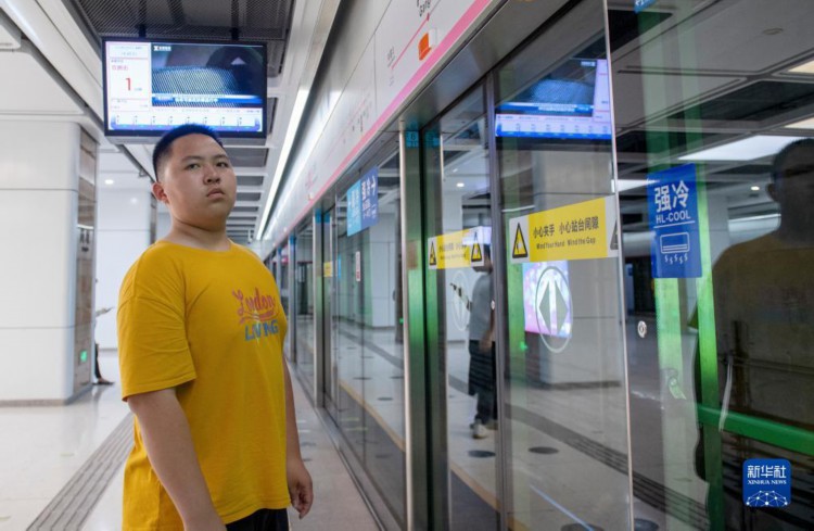 3月30日,黄志能在深圳地铁岗厦站等待地铁到来。 今年44岁的黄少礼是深圳一名闪送骑手,接单跑单时总有一人相伴,就是他16岁的儿子黄志能。 黄志能2岁时确诊孤独症,出于让他多接触外面世界的想法,黄少礼跑单送货时都会带着他。父子俩每日背着包穿梭在城市的大街小巷里,抢单、送货。黄志能方向感很强,找路、换车十分熟悉,比父亲还快。“他脑子里有个地图,去哪里都找得到。”黄少礼说,“送单时,他情绪很好,跟客人都能正常沟通。我希望每天能多接单,让他的情绪保持平稳,将来能够独立生活”。 新华社记者 赵瑞希 摄