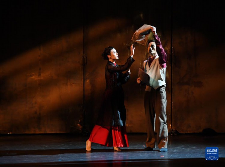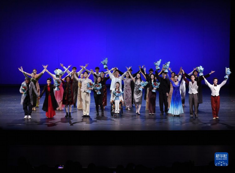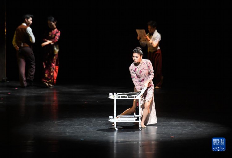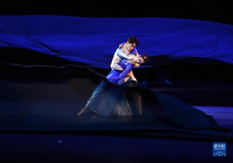 4月3日,演员在舞剧《蓝色裙摆》中表演。