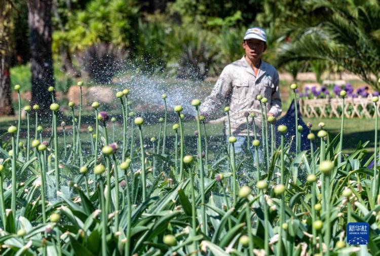 4月3日,一名工作人员在昆明植物园中乌全球葱园(昆明中心)为葱属植物浇水。 近日,昆明植物园中乌全球葱园(昆明中心)内的近十个品种、6000余株观赏葱属植物逐渐迎来盛花期,吸引游客前来观光。据了解,葱属植物具有重要的经济利用价值,许多种类被人类作为食用、药用和观赏植物进行了长期的栽培利用。 新华社记者 陈欣波 摄