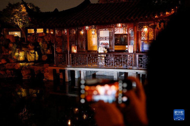 4月5日,游客在苏州网师园欣赏夜游表演。 近年来,江苏省苏州市网师园通过数字化展示手段,结合江南丝竹演奏、昆曲、评弹等传统曲艺表演,不断探索园林夜游发展新模式,将古典美学融入现代生活,为游客展示夜间的园林魅力。 新华社记者 柳文惠 摄