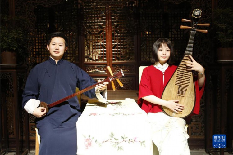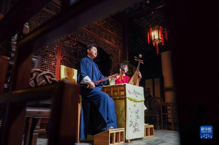 4月5日,演员在苏州网师园内表演评弹。 近年来,江苏省苏州市网师园通过数字化展示手段,结合江南丝竹演奏、昆曲、评弹等传统曲艺表演,不断探索园林夜游发展新模式,将古典美学融入现代生活,为游客展示夜间的园林魅力。 新华社记者 柳文惠 摄