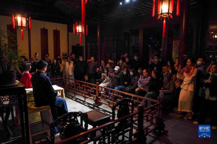 4月5日,游客在苏州网师园欣赏表演。 近年来,江苏省苏州市网师园通过数字化展示手段,结合江南丝竹演奏、昆曲、评弹等传统曲艺表演,不断探索园林夜游发展新模式,将古典美学融入现代生活,为游客展示夜间的园林魅力。 新华社记者 柳文惠 摄