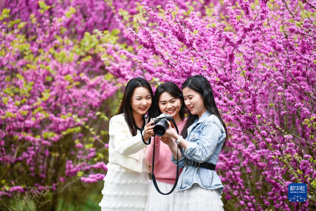 4月7日,游人在贵州省岑巩县天马镇玉门洞景区的紫荆花园赏花拍照。