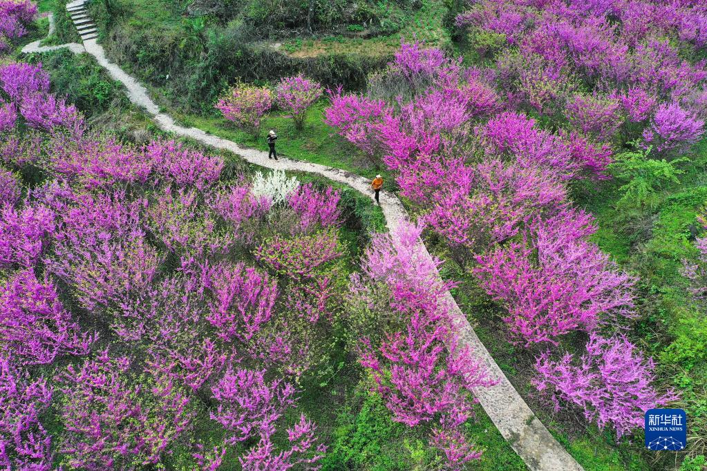 4月7日在贵州省岑巩县天马镇玉门洞景区拍摄的紫荆花园(无人机照片)。 近日,位于贵州省黔东南苗族侗族自治州岑巩县天马镇玉门洞景区的紫荆花竞相绽放,引人入胜。 近年来,当地依托得天独厚的生态资源优势,让美丽乡村绽放“美丽经济”,不断激发乡村旅游活力。 新华社记者 杨文斌 摄
