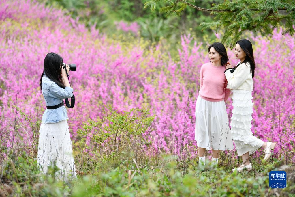 4月7日,游人在贵州省岑巩县天马镇玉门洞景区的紫荆花园赏花拍照。 近日,位于贵州省黔东南苗族侗族自治州岑巩县天马镇玉门洞景区的紫荆花竞相绽放,引人入胜。 近年来,当地依托得天独厚的生态资源优势,让美丽乡村绽放“美丽经济”,不断激发乡村旅游活力。 新华社记者 杨文斌 摄