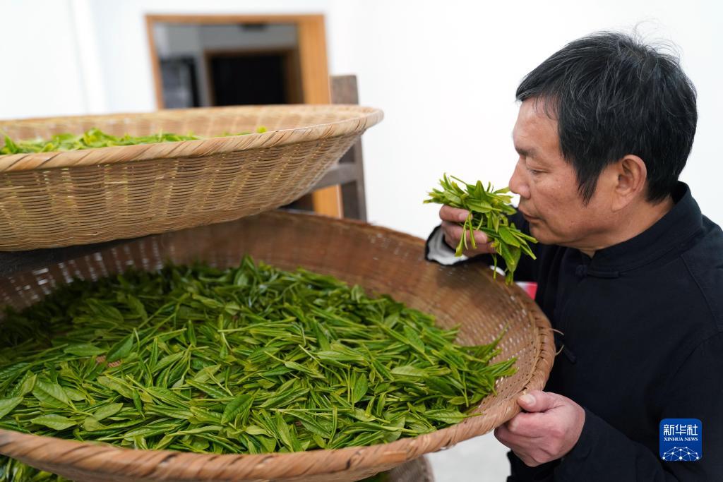 4月8日,在黄山市黄山区新明乡猴坑村茶园,国家级非遗项目太平猴魁制作技艺代表性传承人方继凡在观察茶叶品质。