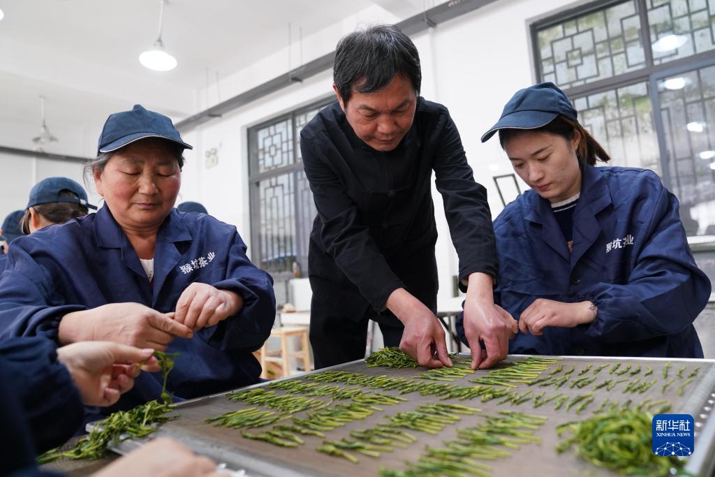 4月8日,在黄山市黄山区新明乡猴坑村,国家级非遗项目太平猴魁制作技艺代表性传承人方继凡(右)指导员工对试采的早熟茶进行理条。