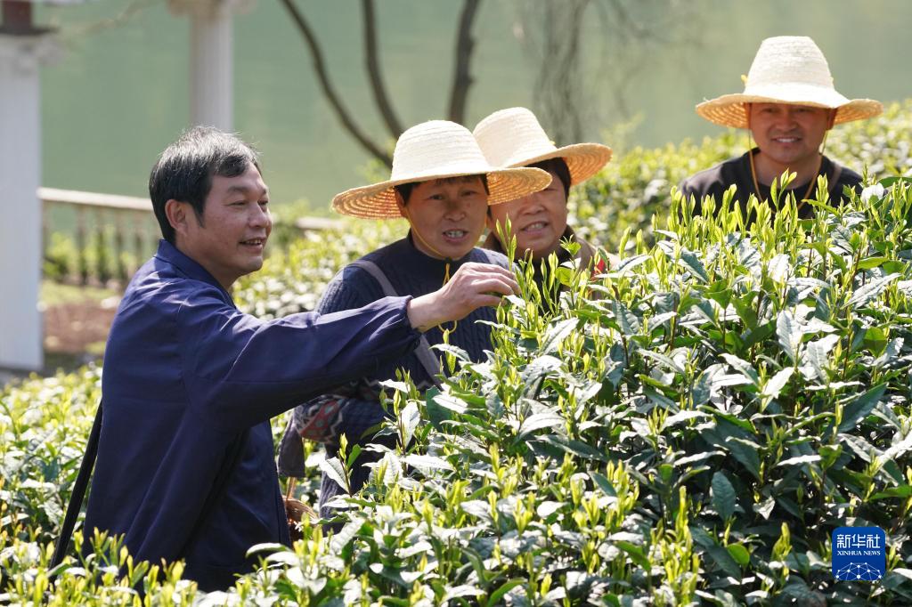 4月8日,在黄山市黄山区新明乡猴坑村茶园,国家级非遗项目太平猴魁制作技艺代表性传承人方继凡(左一)在了解茶叶品质。
