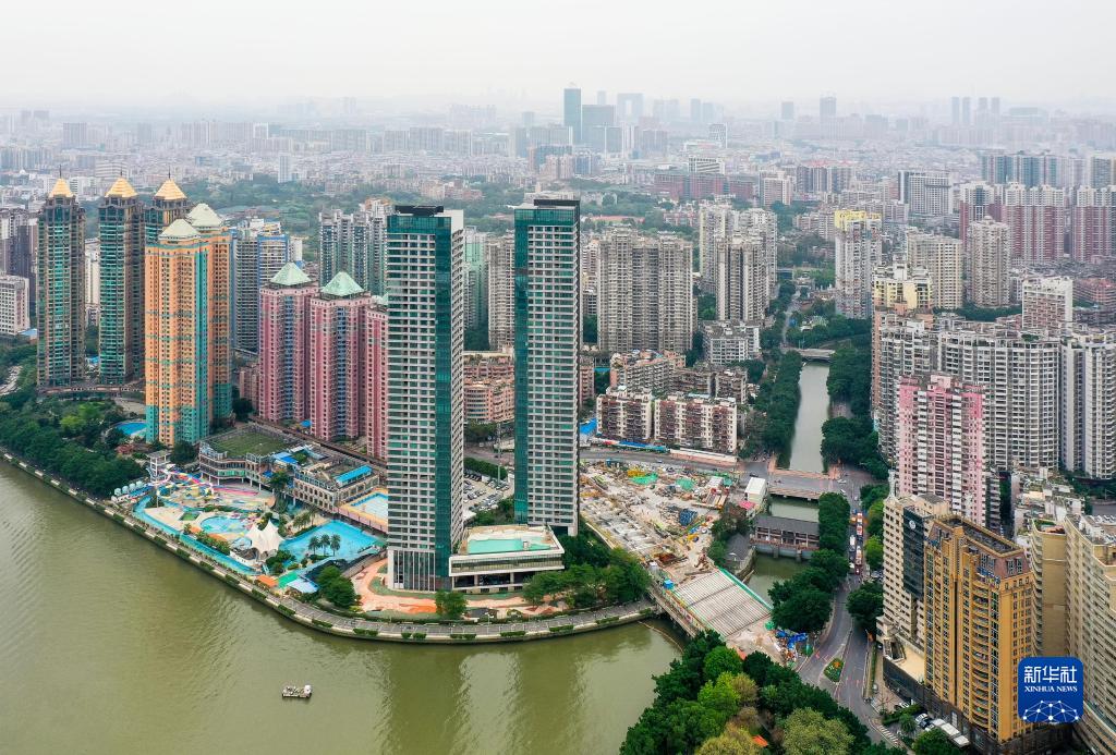 广州地铁10号线滨江东路站周边被珠江和高楼环绕(4月8日摄,无人机照片)。 当日,由中铁十一局承建的广州地铁10号线滨江东路站主体结构封顶。滨江东路站开挖长163米、宽23.3米,由于地处广州海珠中心老城区,紧邻珠江,周边高楼林立,是全线施工难度最大的车站。广州地铁10号线全长25.16公里,横穿天河、越秀、海珠、荔湾四个中心城区。 新华社记者 刘大伟 摄
