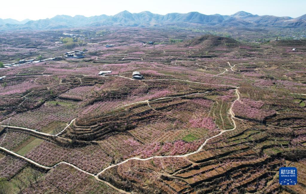 4月8日在河北省保定市顺平县台鱼乡寨子村拍摄的桃园景色(无人机照片)。