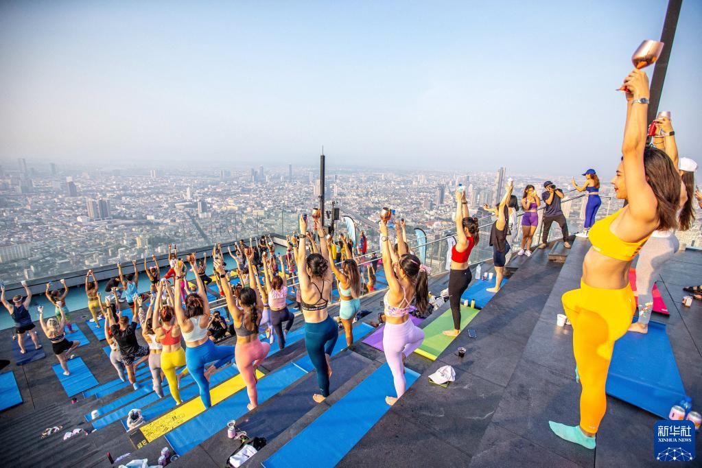 当日,数十名瑜伽爱好者在曼谷王权云顶大厦顶层观景平台体验高空瑜伽。