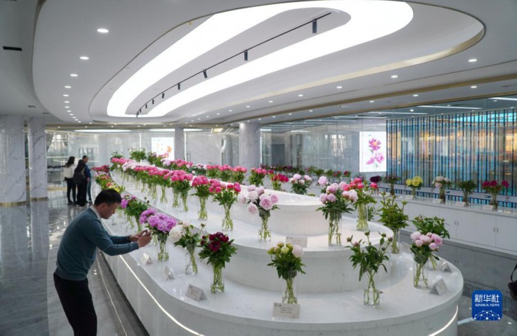 4月9日,在昆明国际花卉拍卖交易中心菏泽分中心,一名参观者在用手机拍摄花卉样品。