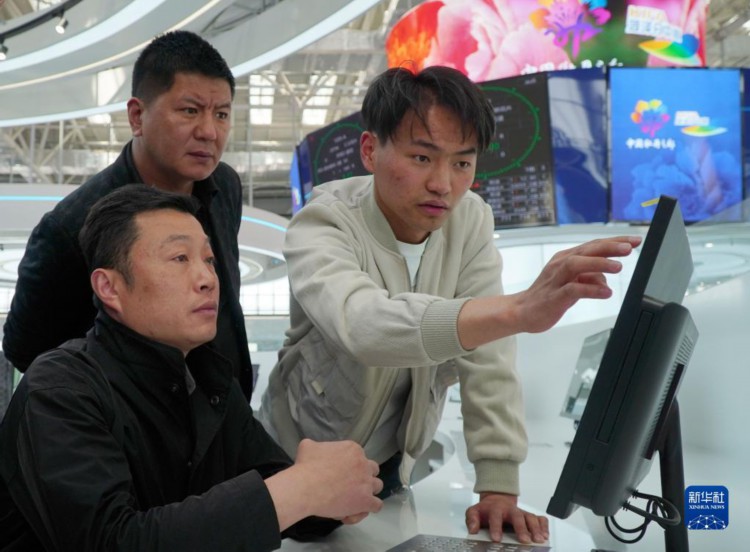 4月9日,在昆明国际花卉拍卖交易中心菏泽分中心,参观者在了解花卉拍卖系统。