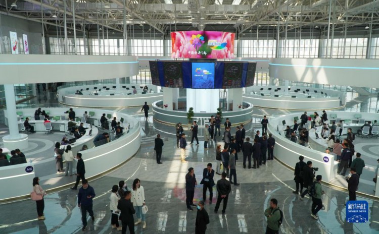 4月9日,人们在昆明国际花卉拍卖交易中心菏泽分中心交易大厅内参观。