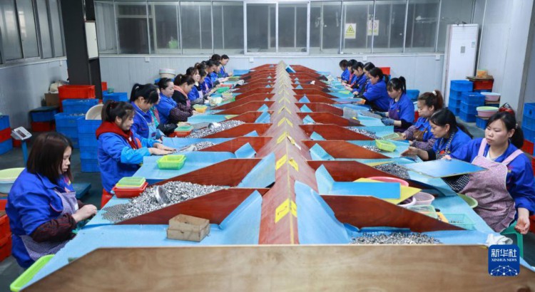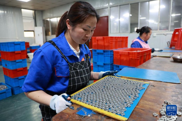 4月10日,搬迁群众在独山县望城社区安置点附近的轴承产业园区内检查成品轴承质量。