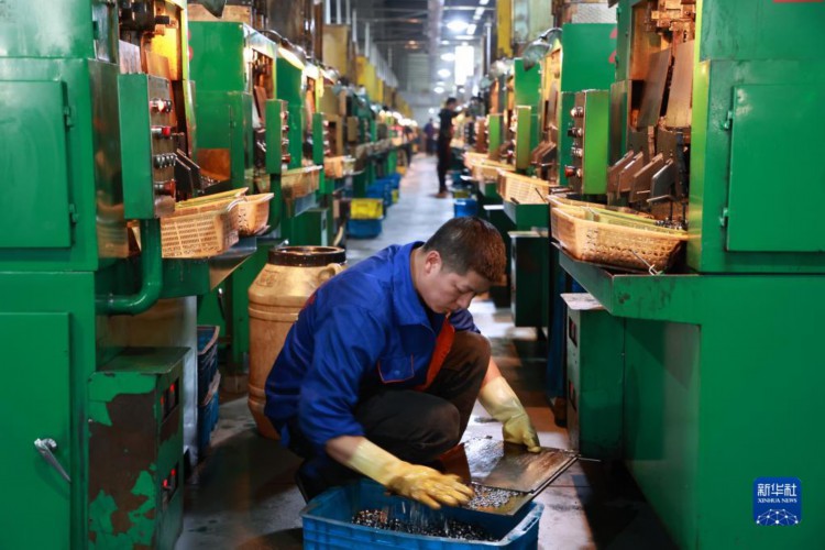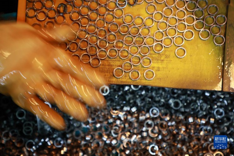 4月10日,搬迁群众在独山县望城社区安置点附近的轴承产业园区内给轴承涂抹润滑油。