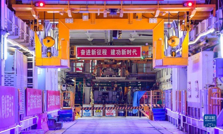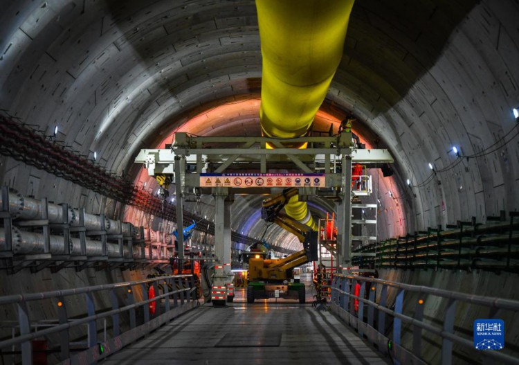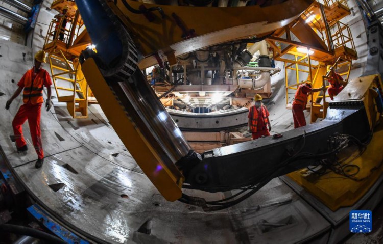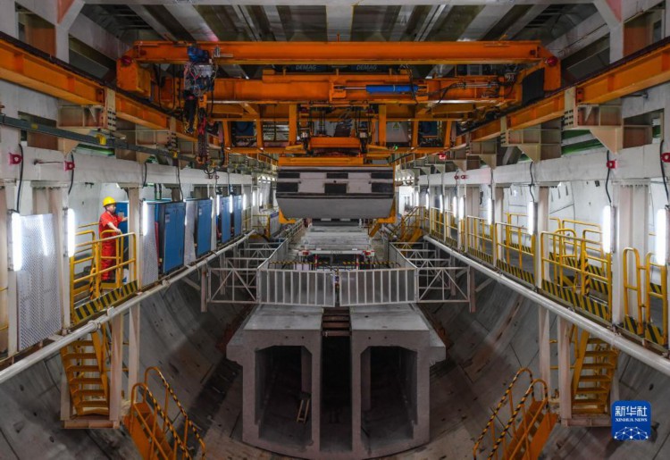 在深江铁路珠江口隧道广州南沙段,中铁隧道局管理人员在“大湾区号”盾构机底部检查管片拼装施工(4月10日摄)。