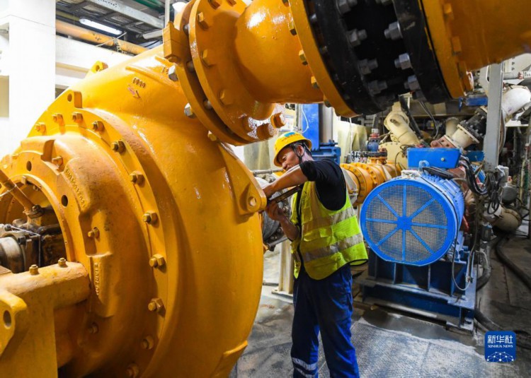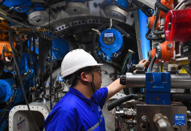 在深江铁路珠江口隧道广州南沙段,中铁隧道局施工人员在检查“大湾区号”盾构机循环泵工作状况(4月10日摄)。