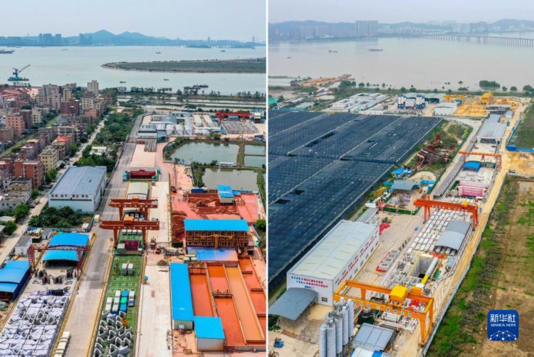 拼版照片:左图为深江铁路珠江口隧道东莞虎门段盾构起始点(4月7日摄,无人机照片),右图为深江铁路珠江口隧道广州南沙段盾构起始点(4月10摄,无人机照片)。