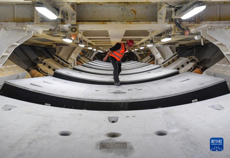 在深江铁路珠江口隧道东莞虎门段,中铁十四局施工人员在检查已拼装管片(4月7日摄)。