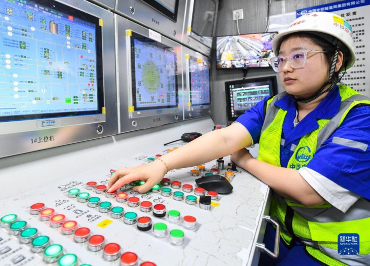 在深江铁路珠江口隧道广州南沙段,中铁隧道局“大湾区号”盾构机主司机杨涔在操控室工作(4月10日摄)。