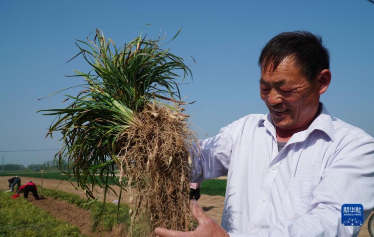 4月10日,在山东省单县高老家乡,一名麦冬种植户在查看麦冬长势。