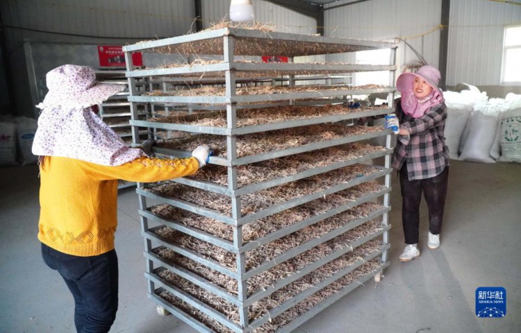 4月10日,在山东省单县高老家乡,村民对收获的麦冬进行干燥处理。