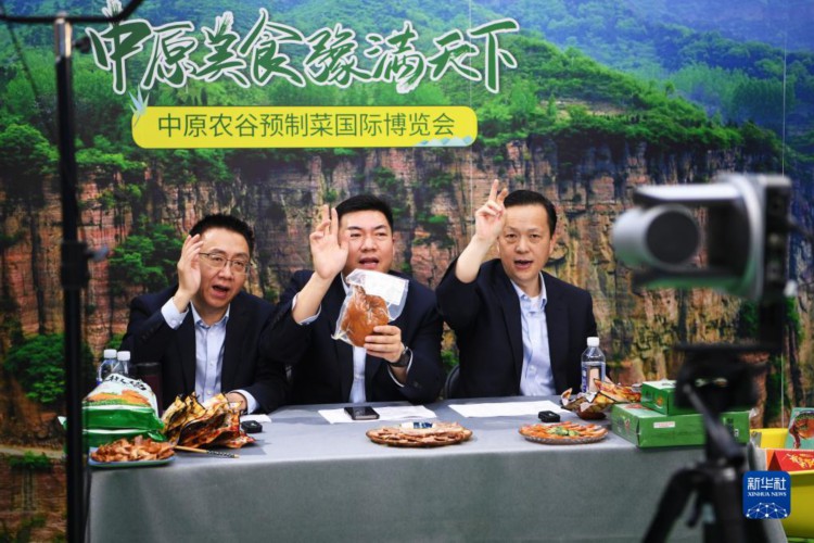 4月10日,参展商在中原农谷预制菜国际博览会上通过直播销售商品。