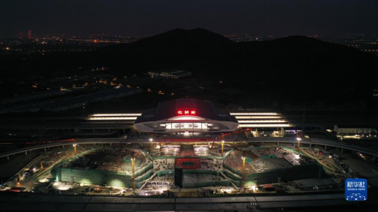 4月10日拍摄的沪宁沿江高铁江阴站站房夜景(无人机照片)。