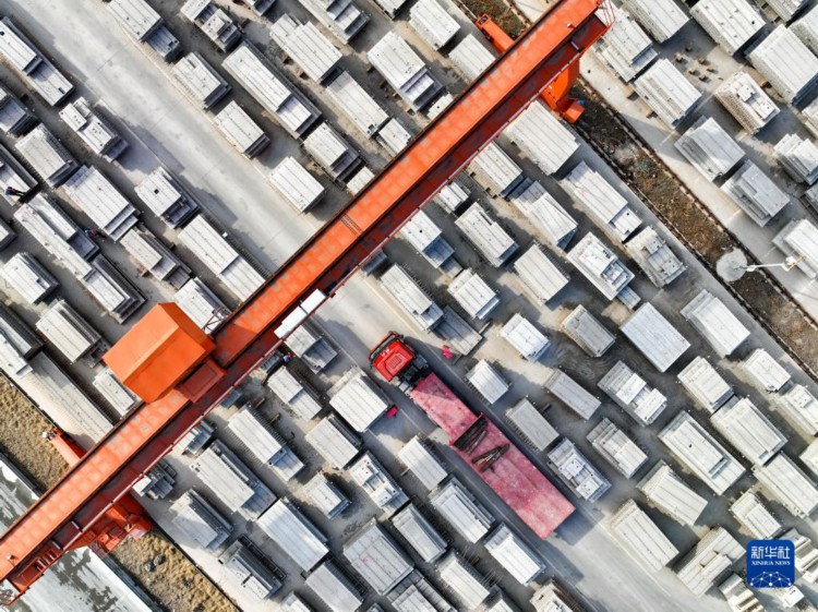 4月11日,卡车在河北省玉田县一家装配式建筑制造企业产品存放区内准备运输产品(无人机照片)。 近年来,河北省玉田县以市场为导向,大力发展装配式建筑制造产业,推动一批产业项目落地生根,为县域经济发展注入新的活力。目前,玉田县共有装配式建筑制造企业十余家,年产值超过36亿元。 新华社记者 牟宇 摄