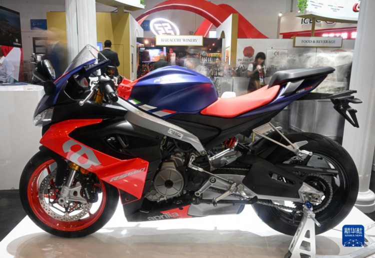 4月11日在消博会意大利企业馆内拍摄的摩托车。