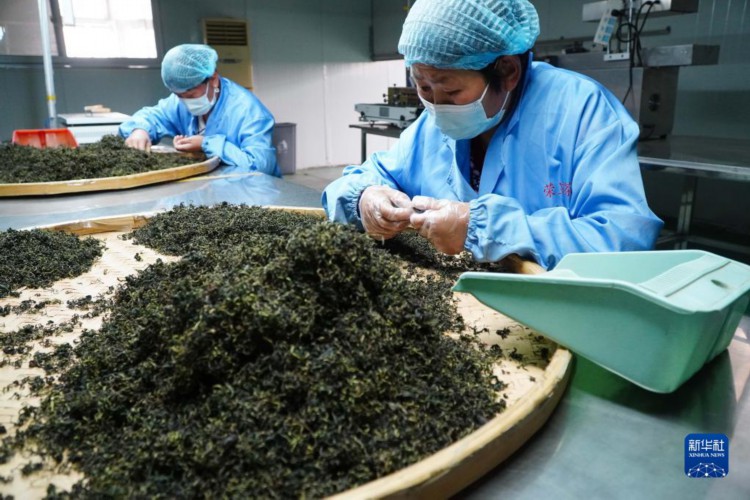 4月11日,在山东省单县黄岗镇的一家蒲公英加工企业,工作人员在筛选蒲公英茶。