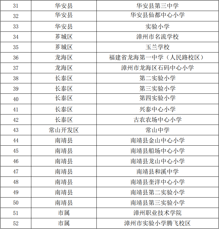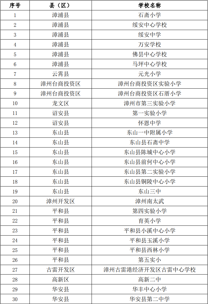 根据《福建省教育厅关于做好为民办实事项目学校体育场地向社会开放工作的通知》(闽教体〔2023〕9号)、《中共漳州市委 漳州市人民政府关于开展2023年为民办实事工作的通知》和《漳州市教育局关于做好为民办实事项目学校体育场地向社会开放工作的通知》(漳教体〔2023〕93号)要求,结合我市实际,拟向社会开放52所学校体育场地。现将向社会开放体育场地学校名单予以公示(详见附件),对公示内容如有异议,请在公示期向市教育局体卫艺语科反映。