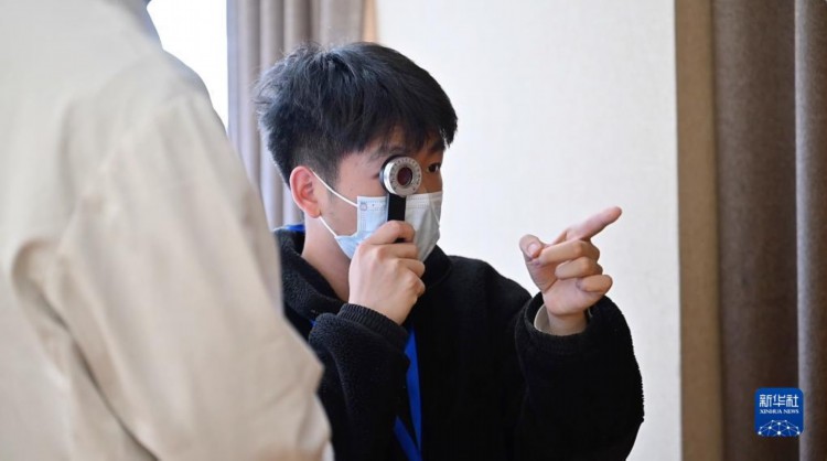 医生为参加海军招飞选拔的学生进行视力检查(2023年4月2日摄,视频截图)。新华社记者 许杨 摄