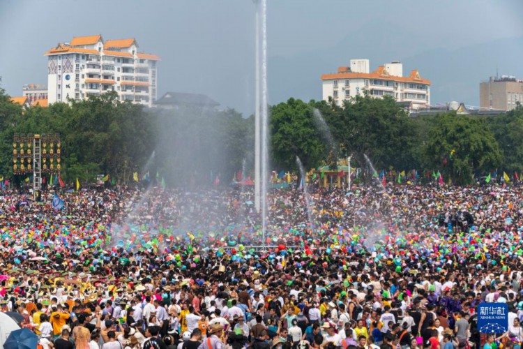 当日,云南省德宏傣族景颇族自治州芒市2023年泼水狂欢节开幕,人们相互泼洒代表幸福、吉祥的清水,表达着相互间的无限祝福。