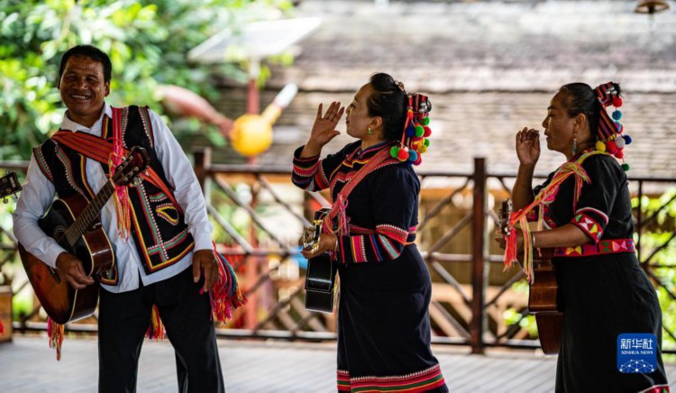 在云南省普洱市澜沧拉祜族自治县老达保村,致富带头人、拉祜族村民李娜倮(中)带领村民演出(2022年7月5日摄)。 新华社记者 江文耀 摄