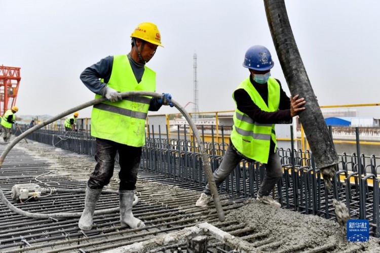 4月13日,在济郑高铁中铁十局济南西制梁场,中铁十局的工作人员在浇筑箱梁。