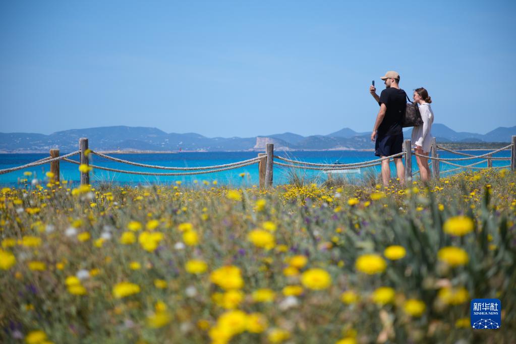 4月11日,游客在西班牙巴利阿里群岛福门特拉岛海边游览。 西班牙巴利阿里群岛有迷人的海湾、壮丽的日落以及广阔的自然景观,是地中海西部最受欢迎的旅游目的地之一。 新华社记者 孟鼎博 摄