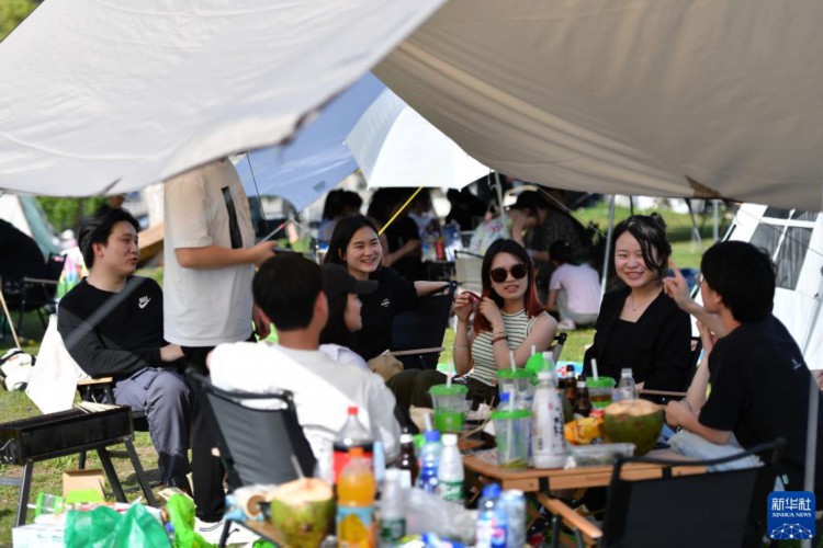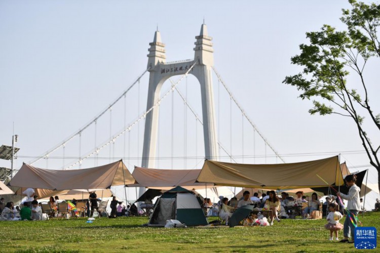 4月16日,市民在长沙市开福区湘江畔露营休闲。 连日来,湖南省长沙市春光明媚、微风和煦,不少市民来到湘江畔露营休闲,乐享春光。 新华社记者 陈振海 摄