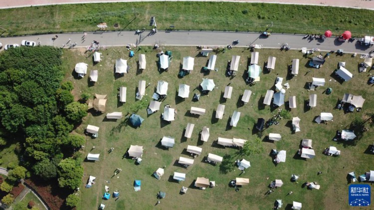 4月16日,市民在长沙市开福区湘江畔露营休闲(无人机照片)。 连日来,湖南省长沙市春光明媚、微风和煦,不少市民来到湘江畔露营休闲,乐享春光。 新华社记者 陈振海 摄