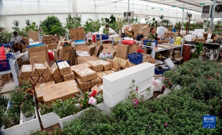4月17日,在河北省廊坊市永清县恒美国际花都,工作人员打包鲜花准备发货。