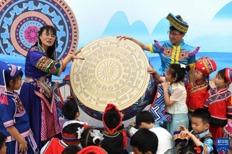 4月17日,一名老师在广西南宁市滨湖路小学为孩子们讲解铜鼓图案。