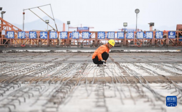 4月18日,工人在黄茅海跨海通道黄茅海大桥铺设钢筋。