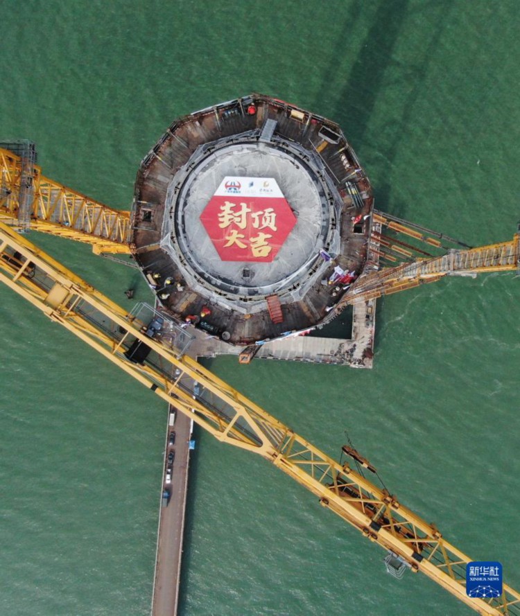 这是保利长大承建的黄茅海跨海通道黄茅海大桥中塔塔顶(4月17日摄,无人机照片)。