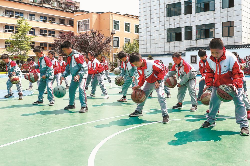 武夷山市余庆小学学生在体育课上进行篮球训练