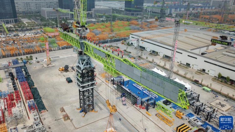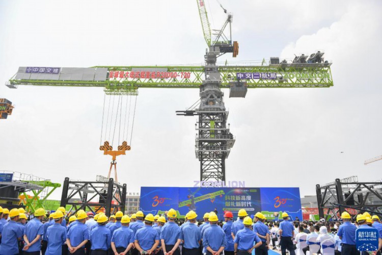 这是4月20日拍摄的中联重科R20000-720塔式起重机下线仪式现场。 当日,中联重科R20000-720塔式起重机在位于湖南省常德市鼎城区的中联重科建筑起重机工业园下线并交付。该起重机最大起重量720吨,最大起升高度400米,主要应用于重大工程建设领域。 新华社记者 陈泽国 摄