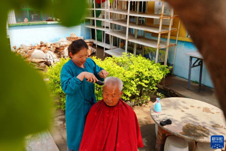 4月20日,志愿者在河北省平乡县后马康村“幸福小院”内为老人理发。