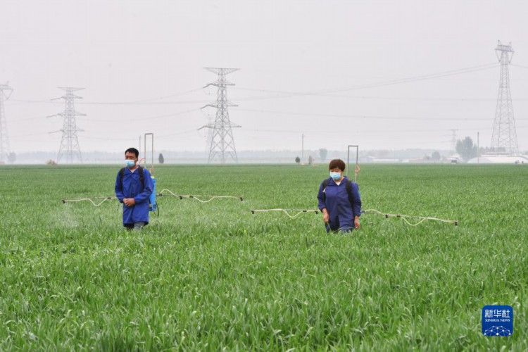 4月20日,张占强夫妇在托管的小地块麦田进行人工喷药。