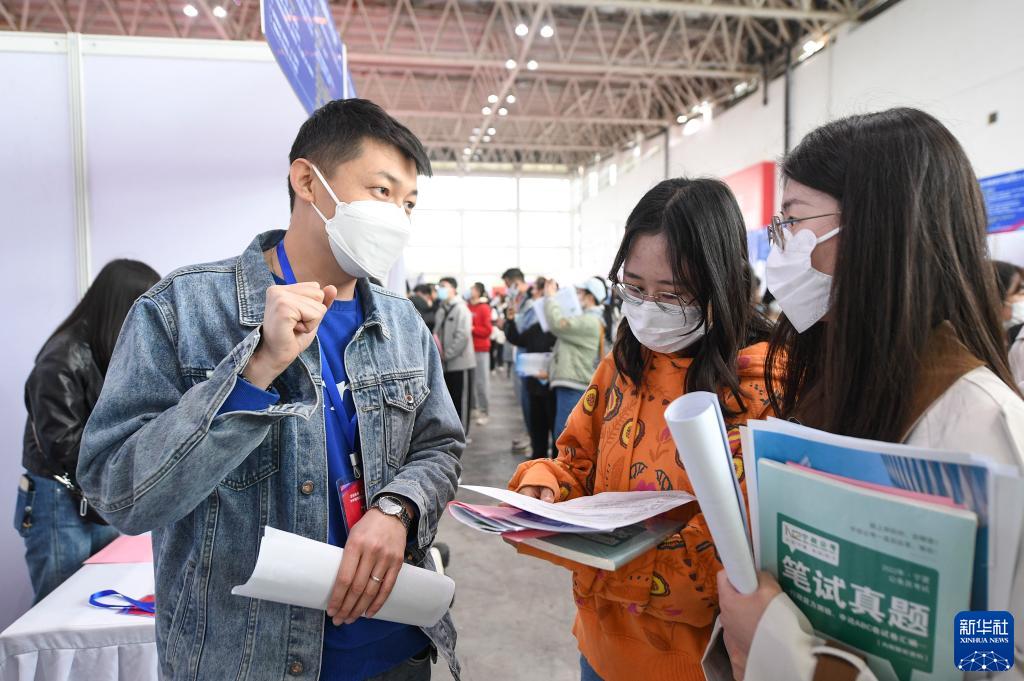 4月21日,求职者(右)在招聘会现场与用人单位工作人员交流。