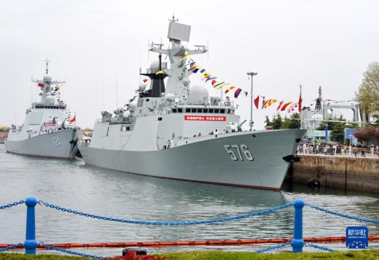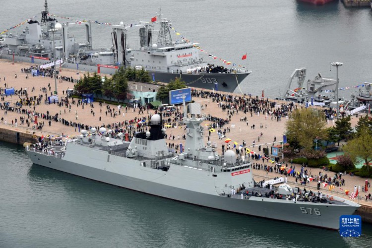 4月22日,海军在青岛的3号码头组织导弹驱逐舰开封舰、导弹护卫舰大庆舰、综合补给舰可可西里湖舰、综合援潜救生船洪泽湖船进行靠泊展示。新华社记者 李紫恒 摄